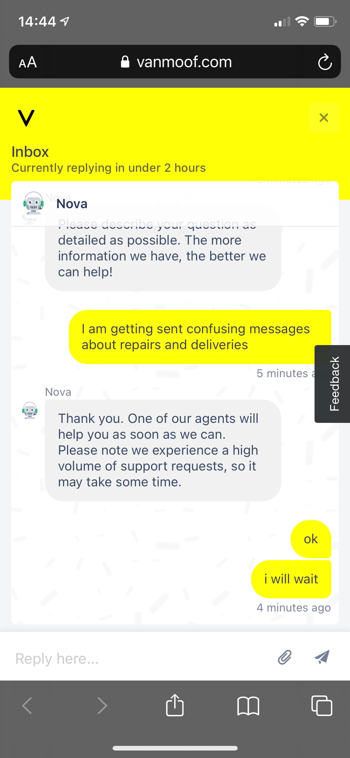 There is no support centre to call, instead there is a chat app on the website. Which, to be honest, I often prefer. However in the case of VanMoof the chat app said “There is a 1 hour wait for an agent”. Ok, not great but I can let it idle while I do other things I suppose.